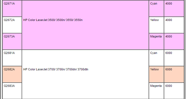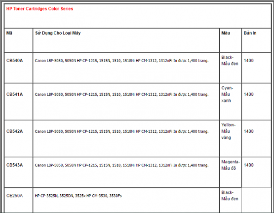 Khi hết mực cần thay mực hoặc chọn loại mực phù hợp với yêu cầu của sếp sẽ mất rất nhiều thời gian để tìm hiểu hoặc tra mã. và để giúp các bạn dễ dàng trong việc chọn loại mực cho máy in phù hợp với nhu cầu của mình. www.thietbimanggiasi.com giới thiệu các bạn bảng tra mã mực Laser Màu. Hy vọng với thông tin này sẽ giúp các bạn chọn được loại mực phù hợp với mình.